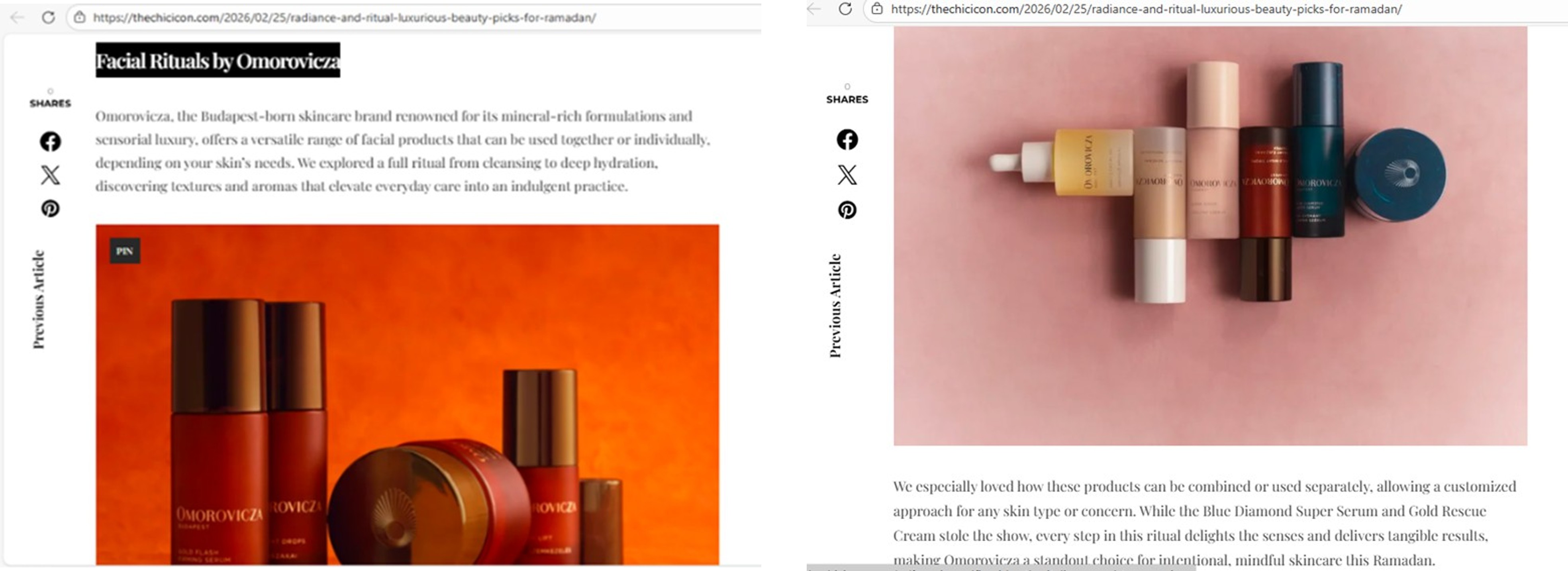 Omorovicza was featured in The Chic Icon on 25 February 2026 in Radiance and Ritual: Luxurious Beauty Picks for Ramadan. The editorial highlighted the Blue Diamond Collection alongside key hero products, including Queen Cleanser, Refining Facial Polisher, Daily Vitamin C Serum, Blue Diamond Super Serum, Gold Eye Lift, and Gold Rescue Cream, positioning the brand around radiance, hydration, and indulgent Ramadan skincare rituals. The feature was further amplified via Instagram, strengthening Omorovicza’s premium visibility within the GCC luxury beauty market.